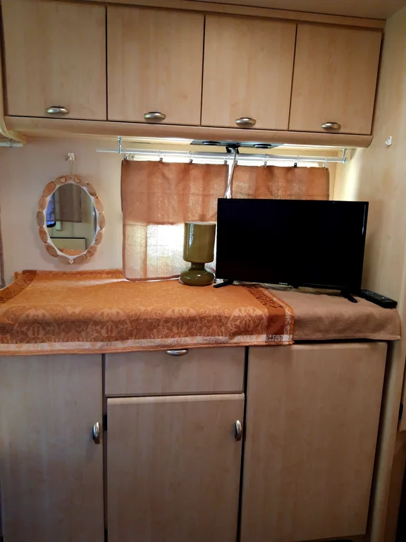 ~ gemütlich eingerichtetes Vorzelt mit Sitzecke und Küchenbereich